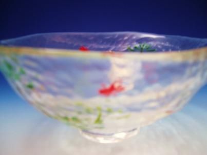 手作りのガラスに槌目をほどこした抹茶碗に京都の絵付師の手描きで描きました。