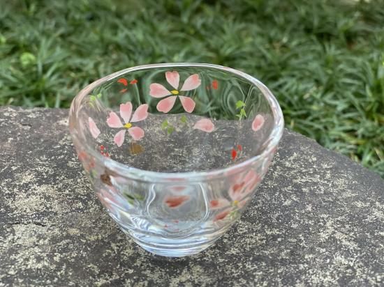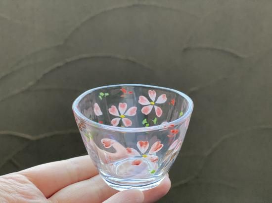 京都の絵付師による手描きの桜のぐい呑みの内側には金、外側には絵を描きました。
