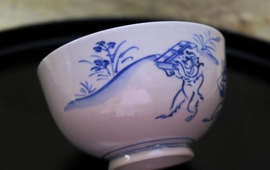 手描き染付千両箱鳥獣戯画汲出碗