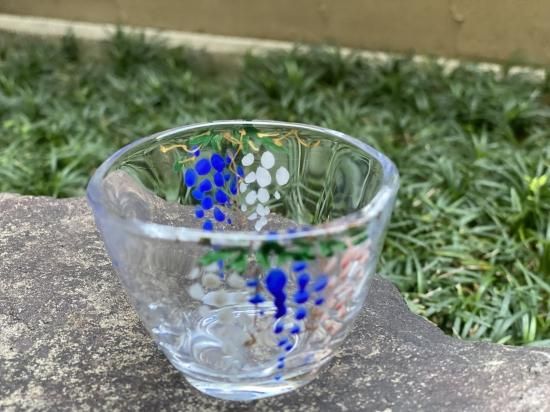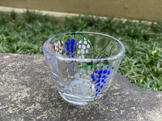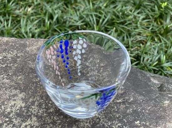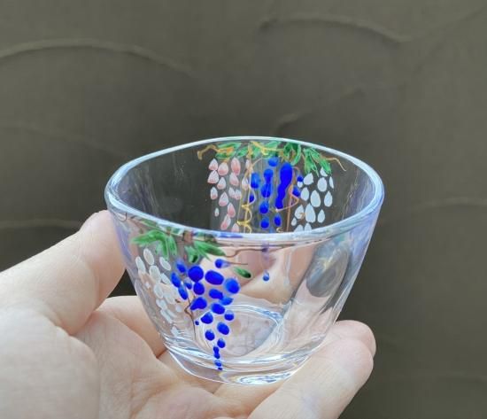 京都の絵付師による手描きの藤のぐい呑みの内側には金、外側には絵を描きました。